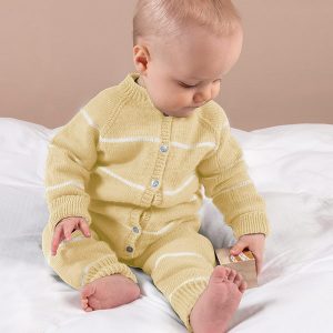 Stickad overall Vårränder - garnpaket i Bluum Soft Merino Ull Stickning 6-9 mån Ljus gul