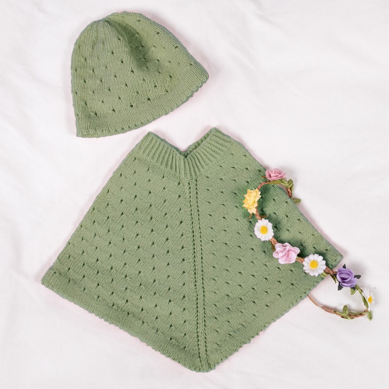 Stickat set Poncho och mössa med hålmönster - garnpaket i Bluum Soft Merino Ull Stickning 4-6 år Jadegrön