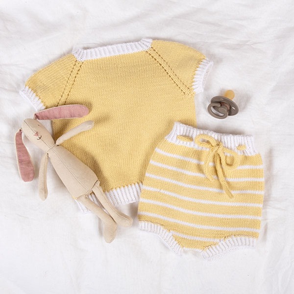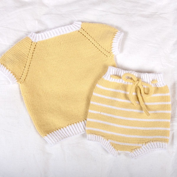 Sticka till sommaren! Detta söta set i tunn merinoull med t-shirt och blöjbyxa med ränder, är perfekt för sommaren. Modellen på bilden är stickad i färgen Ljus gul, men garnpaketet finns i många fler färger. Garnpaketet innehåller mönstret och allt garn du behöver för att sticka setet. Garnsorten är Bluum Soft Merino Ull, 100% extra fin och naturlig merinoull. Stickas på stickor 2,5 och 3. Behöver du stickor? Kom ihåg att beställa i tillägg. Se allt i Ränder-mönster här!